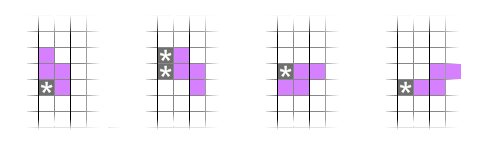 接下來,考慮命題P(n+1)。要想讓“S”形方塊占據(jù)通道n的格子,只有圖5這四種情況。但是,由于我們之前證明了通道n中不能存在“□■”,因此在這個“S”形方塊落下之前,星號方塊都是已經(jīng)有了的了。注意到,每一個“S”形方塊的下落都致使“■□”形結(jié)構(gòu)的減少,但第一種情形除外——它消除了一個“■□”形結(jié)構(gòu),但在其上方帶來了一個新的,使得“■□”形結(jié)構(gòu)個數(shù)保持不變。沒有哪種情形能夠增加“■□”的個數(shù)。但是,通道n的“■□”形結(jié)構(gòu)個數(shù)應該是恒定的,因為它在一個循環(huán)區(qū)里。因此,只有第一種情況才能夠被接受。