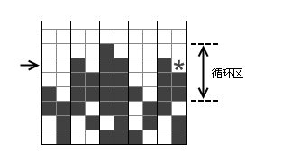 因此,僅含有“S”形方塊的循環(huán)只有一種情況——“S”形方塊在各個通道內(nèi)重疊,填滿并消除若干行后回到初始狀態(tài)。實際循環(huán)區(qū)內(nèi)的每個通道都是一個模樣:底下是0個或多個“■■”,頂部一個“■□”。注意,最右側(cè)那個通道的最頂端是一個“■□”,右邊這個空白一輩子也不可能用“Z”形方塊填上。也就是說,在一個只含“S”形方塊的循環(huán)區(qū)內(nèi),必然會有某一行,它的最右側(cè)是一個“■□”,它保證了該行不能僅用“Z”形方塊消掉。如圖6所示,箭頭所指的行無法單用“Z”形方塊消除,因為星號位置不可能用“Z”形方塊填充。