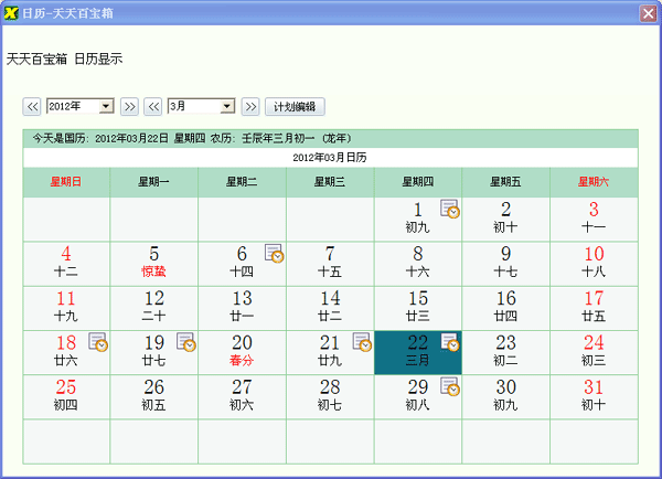 天天百寶箱包括了平時(shí)你需要的所有常用功能。如公歷農(nóng)歷查詢 ,計(jì)劃提示,計(jì)賬管理,定時(shí)關(guān)機(jī),屏幕捕捉,網(wǎng)頁截圖,系統(tǒng)垃圾清理,圖片自動(dòng)播放等功能。