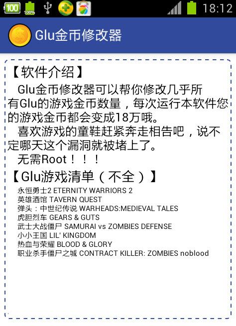 glu金幣修改器是一款能夠所有GLU游戲金幣數(shù)量的修改工具,glu金幣修改器支持《命運(yùn)英雄傳》《槍火兄弟連2》《武士大戰(zhàn)僵尸2》等幾乎所有Glu游戲,每次運(yùn)行修改器您的游戲金幣都會變成18萬,而且無需root即可使用,方便快捷。