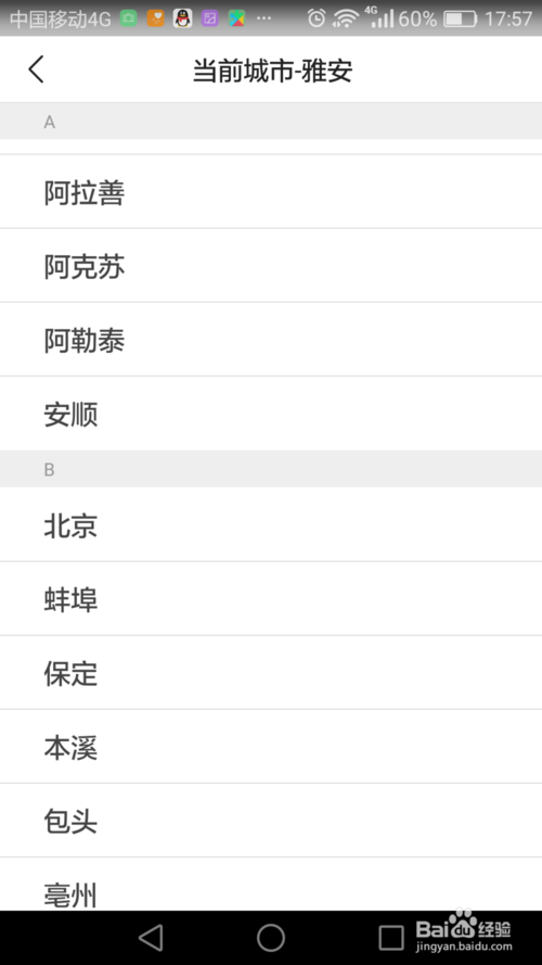 找到您要切換的城市,如北京。城市分組是按這個城市的拼音第一個字母來分組的。