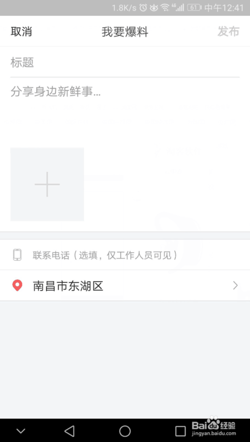 接著就來到了爆料的編輯界面,這里,我們可以看到一些具體的爆料標題-內容-圖片的設置,如圖。