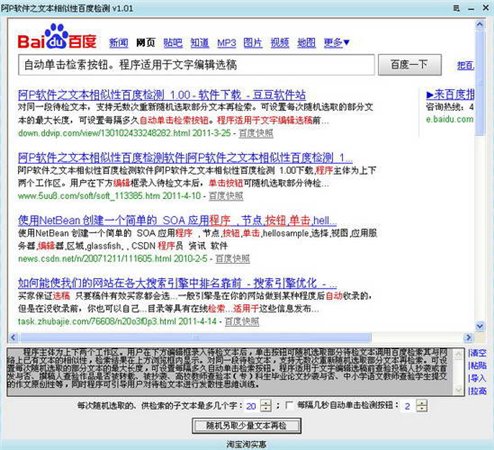 程序主體分為左右兩個工作區(qū)。用戶在右側(cè)編輯框輸入待檢文本后,單擊按鈕,程序可順序或隨機(jī)(用戶可設(shè)置)選取待檢文本中部分文字(文字長度可設(shè)置),調(diào)用百度,檢索這段文字與網(wǎng)絡(luò)上已有文本的相似性,百度檢索結(jié)果在左側(cè)瀏覽框內(nèi)顯示。對同一段待檢文本,軟件可無數(shù)次重新順序或隨機(jī)選取另外長度的文本再檢索。