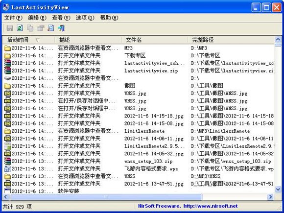 LastActivityView 直接調(diào)用系統(tǒng)日志,能顯示以下事件的發(fā)生時間、名稱、路徑: