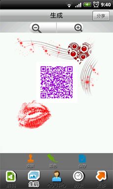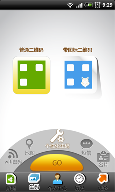 2.個(gè)性化生碼:擁有短信、聯(lián)系人、微博、地圖等十三項(xiàng)最為常見(jiàn)和熱門的生碼選項(xiàng),不但可以進(jìn)行加密處理,還附有4個(gè)圖標(biāo)、6個(gè)皮膚、9種顏色任意搭配,同時(shí)還提供自定義皮膚選項(xiàng)。