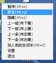 Alt+x為暫停與繼續(xù)播放之間切換鍵;Alt+a為靜音與播放單詞讀音之間切換鍵;Alt+z為隱藏窗口與顯示隱藏的窗口之間切換鍵;Alt+d把當(dāng)前顯示的單詞添加到生詞本,生詞本在本軟件安裝文件夾中data的文件夾中;按方向鍵能調(diào)整顯示的內(nèi)容,↑(向上鍵)為下一組,↓(向下鍵)為上一組、←(向左鍵)為上一條、→(向右鍵)為下一條。彈出式菜單的()內(nèi)注明了各功能塊的快捷鍵。
