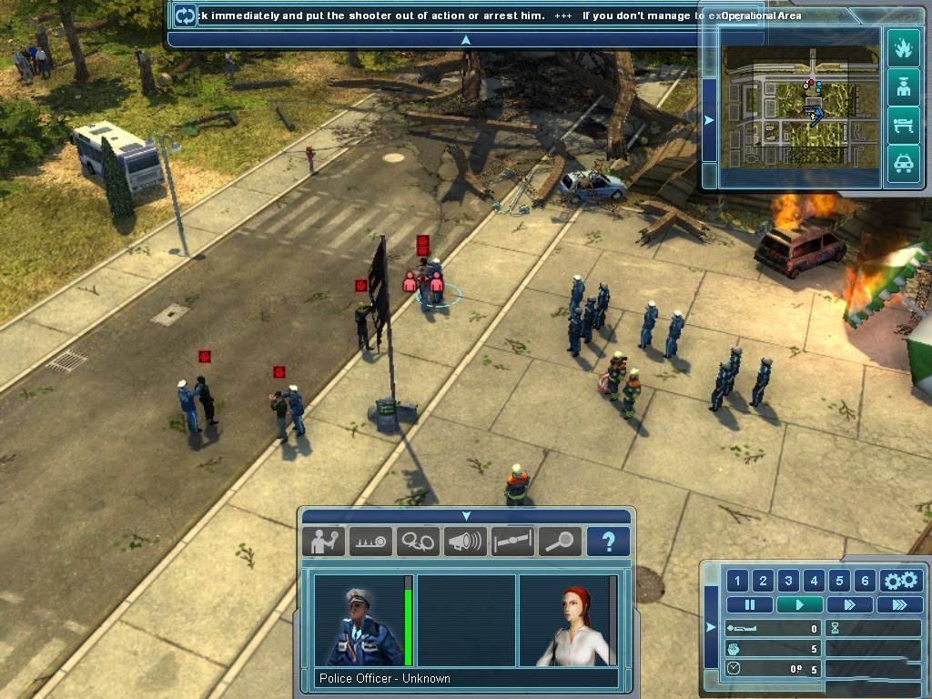 首先則是暴動(dòng)頭目的抓捕。這里比較簡(jiǎn)單,你手下的警察足夠抓捕這些嘍啰的。不過(guò)為了避免額外的傷害,你需要首先派遣消防員把后面的圍觀記者移動(dòng)到后面的安全區(qū)域