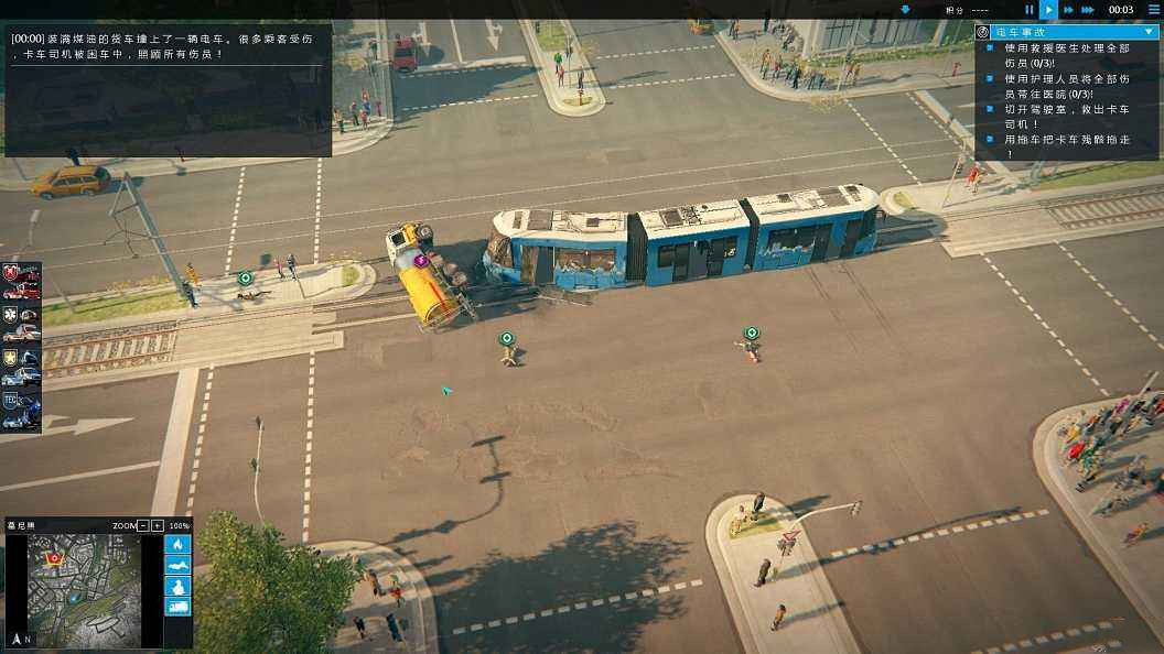 首先我們來(lái)看一下游戲操作和上手感,本游戲操作極其簡(jiǎn)單。不需要你建設(shè)基地之類(lèi)的,游戲會(huì)給你分配救援車(chē)輛供你使用,包括警車(chē)、消防車(chē)等。你用左鍵選擇車(chē)輛,右鍵卸載乘客(警察、消防員),然后讓他們從車(chē)上拿取必要的設(shè)備,用于救援,或穩(wěn)定群眾。
