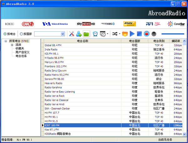 國外電臺(tái)AbroadRadio包括國內(nèi)外電臺(tái),含五大洲,四大洋,目前有近7800個(gè)電臺(tái),電臺(tái)分類也極細(xì),有搖滾樂,爵士樂,拉丁,舞曲,新聞,瑞格舞,熱帶雨林,宗教音樂,體育,佛教,喜劇等超過50種。另外還精選了世界上眾多的知名電臺(tái),包括有BBC,VOA,RAI,半島電視臺(tái),KBS,FOX,CNN,MBC,SKY,RAI,RFI等知名電臺(tái)。語言覆蓋了,中文,英語,日語,韓語,西班牙語,俄語,德語,意大利語等等。且據(jù)我親測,連通率都達(dá)到95%以上,更為關(guān)鍵的是,作者還為使用者提供了個(gè)性化的設(shè)置。即,你可以按照自己的想法和意愿讓作者對(duì)軟件進(jìn)定制,打造只屬于你的,獨(dú)一無二的軟件。