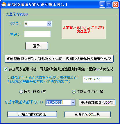 下載壓縮包之后,解壓縮到某個地方,比如桌面上,然后雙擊其中的“QQ說說互轉互評互贊工具”,如果你已經(jīng)登錄了QQ,也可以點右邊的快速登錄,則無需再次輸入密碼,點了“無需輸入密碼,通過QQ官方接口,點這里進行快速登錄”按鈕之后,在打開的qq官方網(wǎng)頁中點“快速登錄”或手工輸入qq號和密碼,登錄成功之后,關閉那個網(wǎng)頁窗口,回到軟件主界面,點“開始互轉互評”按鈕,就可以了。