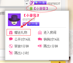 點(diǎn)擊該用戶的昵稱,彈出如下資料頁,選擇“贈送禮物”,則收禮人變成“小游客”