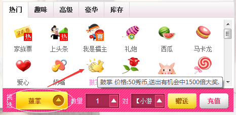 點(diǎn)擊“挑選禮物”彈出禮物列表,有熱門、趣味、高級、豪華、庫存等幾個分類,選擇禮物(如鼓掌)