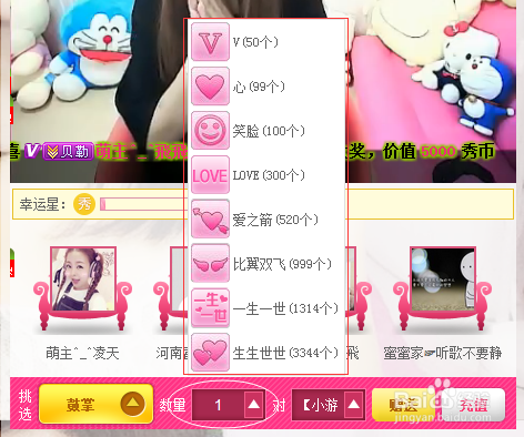 初次默認(rèn)的送禮數(shù)量是1個,手動輸入送出數(shù)量(最多9999個)或點(diǎn)擊“小三角號”可選擇送出禮物后的效果(V形、心形、笑臉、LOVE等)
