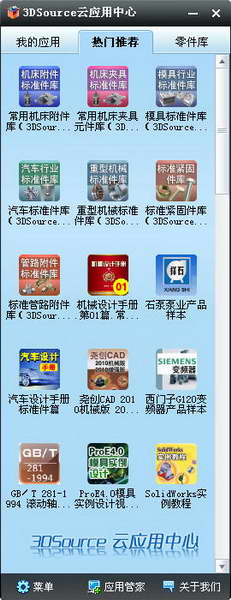 3dsource云應(yīng)用中心是為廣大工程師群體打造的應(yīng)用資源共享服務(wù)平臺(tái)。其采用全新的app模式,云集了海量3d模型、2d圖紙、產(chǎn)品樣本、設(shè)計(jì)手冊(cè)、標(biāo)準(zhǔn)、培訓(xùn)教程、論文、工具軟件、hao網(wǎng)址等各式各樣的應(yīng)用資源。