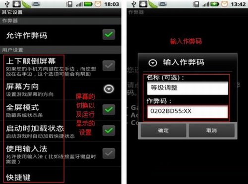 5、玩游戲還是有很多朋友都只是圖個(gè)痛快的,所以對(duì)于一些難度比較大的關(guān)卡來(lái)說(shuō)還是喜歡弄點(diǎn)小動(dòng)作。點(diǎn)擊菜單選擇設(shè)置→其他設(shè)置將允許作弊碼勾上試試看吧,在運(yùn)行游戲的時(shí)候就可以選擇對(duì)應(yīng)游戲的作弊碼對(duì)游戲的整體屬性(例如等級(jí)、攻擊等等)進(jìn)行修改了。這個(gè)作弊碼其實(shí)就是類似一個(gè)作弊器一樣的小玩意。GameBoid同時(shí)支持目前主流的三種作弊碼(GameShark、Action Replay、Code Breaker)。不過(guò)需要告訴一下各位,作弊碼并不是通用的,而且獲取的途徑一般是通過(guò)網(wǎng)絡(luò)獲取,一款游戲同時(shí)只能對(duì)應(yīng)一項(xiàng)作弊修改。