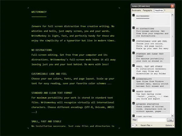 WriteMonkey 2.4.0.15 綠色版 WriteMonkey為一款全屏編輯器,WriteMonkey可以快速編寫,編輯和保存您的筆記。您擁有WriteMonkey就是擁有一臺(tái)打字機(jī)怎么簡單,從而生活就更方便了。隨著WriteMonkey您就可以快速編寫,編輯和保存您的筆記。