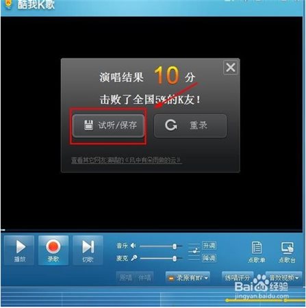 錄唱完畢之后可以點(diǎn)擊--試聽,聽一聽自己的效果,如果不滿意,可以選擇重錄。