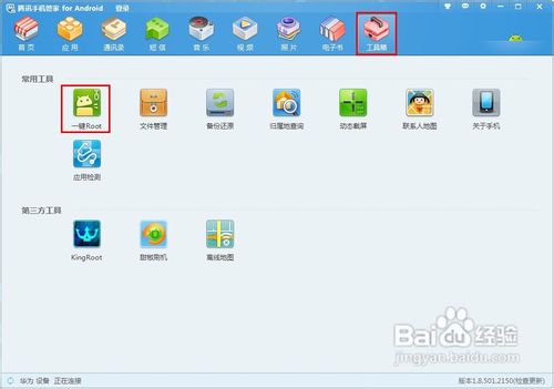 1.用USB數(shù)據(jù)線將手機(jī)與電腦連接, 打開騰訊手機(jī)管家PC版點(diǎn)擊工具箱找到一鍵Root2.點(diǎn)擊一鍵root,勾選同意《免責(zé)聲明》點(diǎn)擊下一步