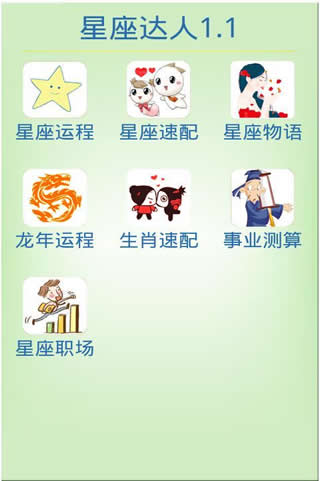 星座達人包括以下內(nèi)容:星座運程、星座速配、星座物語、龍年運程(生肖運程)、生肖速配、事業(yè)測算、星座職場。星座運程:讓你隨時隨地了解你的星座運勢。包括整體運勢、愛情運勢、工作學業(yè)運勢、財運分析。助力你的2012! 星座速配:想知道你和他(她)的速配指數(shù)?快來試試星座配對! 星座物語:缺少星座談資?看看星座物語吧!星座物語直擊你的愛情、生活,為你的生活天姿添彩!
