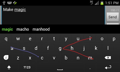 《劃屏輸入法Keymonk Keyboard》的輸入法采用了完全類似Swype的文字輸入方式,但是不同的是支持雙手輸入。只需要按住屏幕,不間斷地連接字母,你所想要的單詞就會出現(xiàn)!這款輸入法,確實不同于以往的方法,新穎易用。至于速度與適應(yīng)性的問題,因人而異~最重要的賣點在于雙手滑動操作。從雙手滑動操作來看樂趣性十足!
