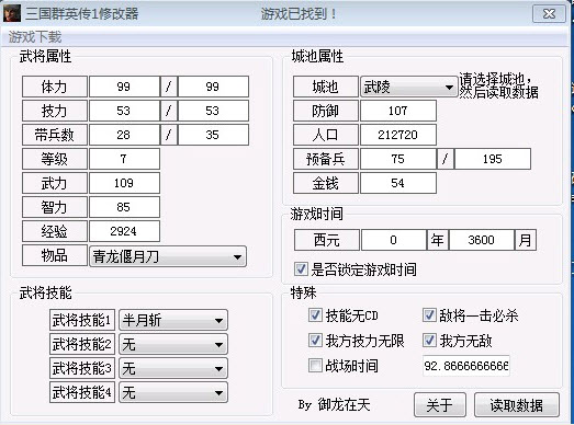 特殊技能修改,技能無CD冷卻,敵將一擊秒殺,我方技力無限,我方無敵,戰(zhàn)場時間調(diào)整