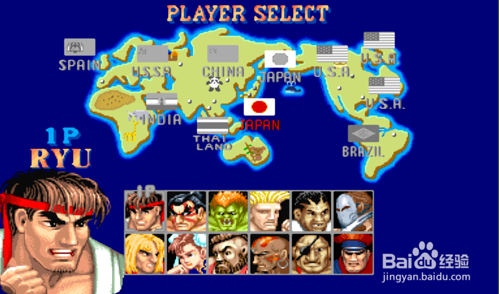 選RYU之后,在GUILE那關(guān)故意輸給計算機,然后投錢繼續(xù)接關(guān)按2P的開始鍵出來,再選RYU,這時,原本應(yīng)