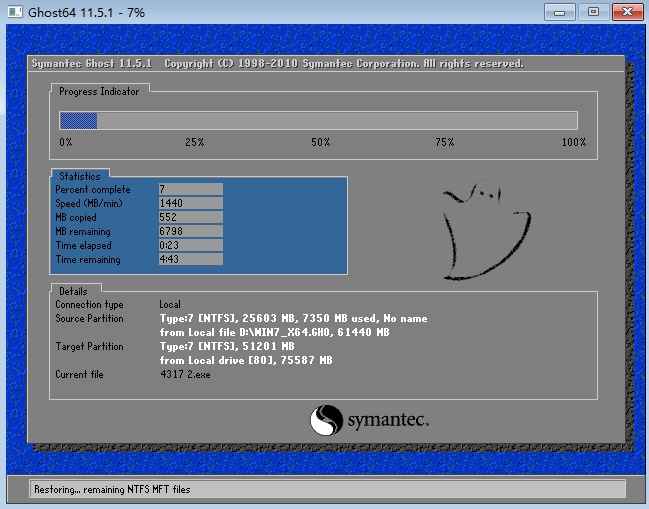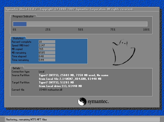 8、出現(xiàn)下面的界面后,就開(kāi)始重新備份系統(tǒng)了,備份完系統(tǒng)后,電腦就會(huì)重新啟動(dòng)了。下一次電腦出現(xiàn)系統(tǒng)方面的故障后,進(jìn)行一鍵還原就可以了。