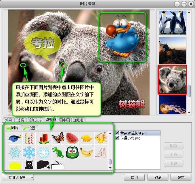 【點(diǎn)綴圖】標(biāo)簽——在“圖片”標(biāo)簽的圖片列表中,點(diǎn)擊一個(gè)圖案可以給當(dāng)前的圖片添加一個(gè)或多個(gè)裝飾圖,通過(guò)鼠標(biāo)拖拽圖片外的框體可以進(jìn)行移動(dòng)和縮放操作,在“設(shè)置”標(biāo)簽中可以設(shè)置當(dāng)前選定的點(diǎn)綴圖的旋轉(zhuǎn)、反轉(zhuǎn)和透明度等參數(shù)。