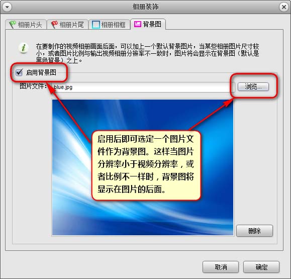 背景圖設(shè)置——勾選【啟用背景圖】啟動(dòng)該功能,點(diǎn)擊【瀏覽】添加一個(gè)背景圖文件。這個(gè)背景圖會(huì)做為一個(gè)襯托出現(xiàn)在相冊(cè)展示圖片的后方背景上。對(duì)于那些豎幅圖片,和寬幅的視頻文件,在展示中不能全屏顯示的時(shí)候。上下左右出現(xiàn)的黑邊會(huì)被背景圖覆蓋。