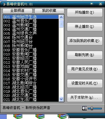 易峰收音機(jī)為您提供上千檔精彩節(jié)目和全國200多個主流電臺。軟件界面清晰,操作簡單。想聽哪個電臺只需選中雙擊就可以了。易峰收音機(jī)還配備定時、電子郵件這些小功能。是不錯的電臺收聽軟件。