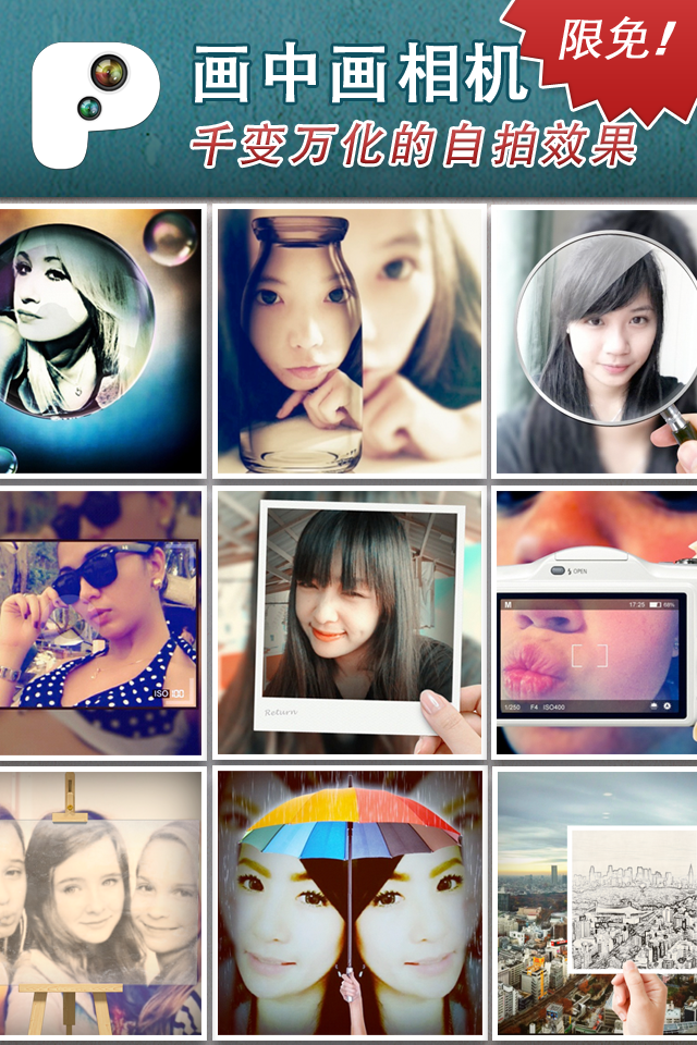 畫中畫相機(jī)獨創(chuàng)【畫中畫】特效:隨手拍,馬上變藝術(shù)照!拍照軟件不稀奇,圖片處理應(yīng)用更不少,要說現(xiàn)在的商店里什么軟件最多,那非此類應(yīng)用莫屬,如果開發(fā)商還想在此基礎(chǔ)上贏得一席立足之地,光有好產(chǎn)品還不行,你得夠“另類”,夠創(chuàng)新,及別人所未及,想別人所未想,只有這樣的產(chǎn)品才可能博得用戶喜愛。【軟件特點】