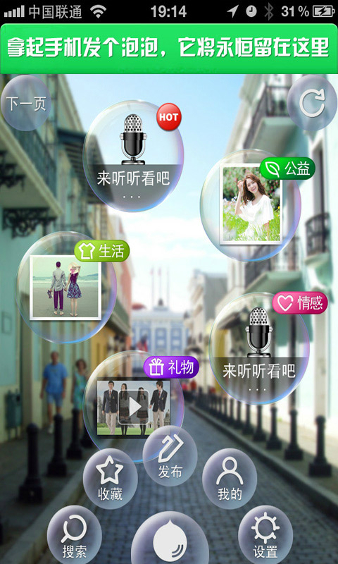 1、按距離找到你身邊的最愛,第一時間響應(yīng)他(她)。2、增強現(xiàn)實,發(fā)布的泡泡漂浮在現(xiàn)實的天空中。