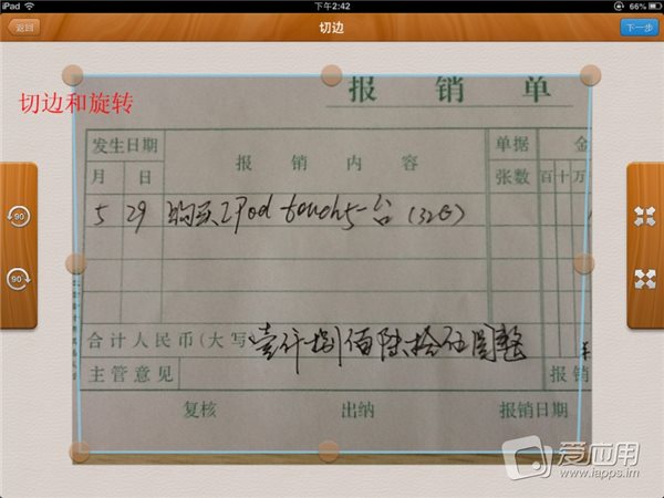 切邊:選擇完成拍攝,可以自動彈出切邊頁面,拉動8個藍(lán)色的點(diǎn)來控制圖像的邊緣。確認(rèn)之后,會繼續(xù)彈出一個美化頁。