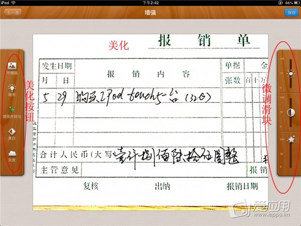 美化:左邊邊框上有 5 個類似濾鏡效果的按鈕,分別是不增強(qiáng),增亮,增強(qiáng)并銳化,黑白,灰度。其中“不增強(qiáng)”可以撤消下面四種操作!其他四種效果都是比較實(shí)用的~右邊有三個微調(diào)欄。
