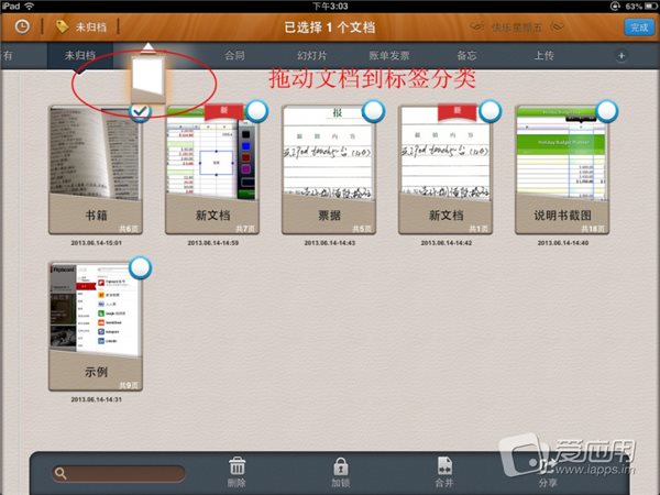 將文檔歸類的標(biāo)簽下:無論在哪個分類標(biāo)簽下,長按文檔直到出現(xiàn)一個信封圖標(biāo),再將其拖到相應(yīng)的標(biāo)簽上,注意,不要拖動超出范圍。