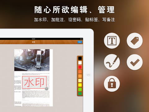 手寫涂鴉:選擇單頁,選擇左上方的第一個圖標(biāo),之后選擇工具,你可以給文字加背景色或者手寫來快速記下某些東西,值得一提的是,應(yīng)用還提供了豐富的顏色調(diào)整功能。