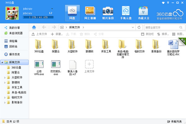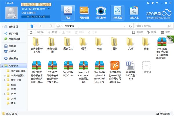 如果你擔心存放在電腦里的重要資料因為意外丟失,或者你嫌用U盤拷貝太麻煩想把資料儲存在網上,那么使用網盤就是你最好的選擇。在眾多網盤中,360云盤擁有15G的超大免費空間,能夠存放30000份工作文檔,7500張親人的照片,或者3000首你最愛的歌曲,是您的絕對首選網盤。360云盤是奇虎360公司推出的在線云儲存軟件,國內最安全、最穩(wěn)定、最快、最大的免費網盤。無需U盤,可以讓照片,文檔、音樂、視頻、軟件、應用等各種內容,隨時隨地觸手可及,永不丟失。并且360云盤為每個用戶提供36G的免費初始容量空間,網盤存儲空間無上限。