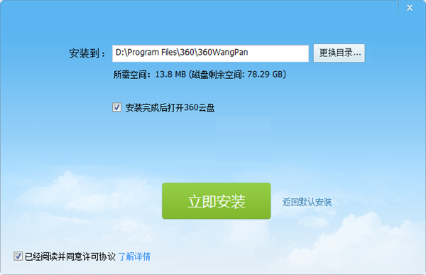 1、首先我們需要下載360云盤并安裝程序,360云盤的默認安裝目錄不是C盤,所以可以選擇默認安裝,想換安裝盤的也可以自己選擇。