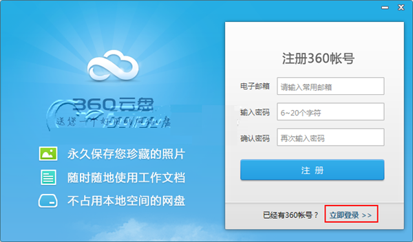 也可以在360云盤首頁注冊賬戶,直接使用。