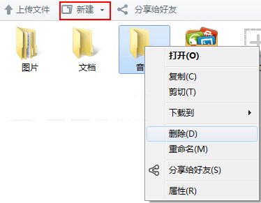 3、我們可以在云盤中新建文件夾來整理我們上傳的文件,程序默認三個文件夾可以自定義文件名或刪除。新建中可以選擇新建壓縮文件、文件夾或是文本文檔。