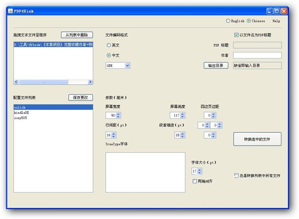 PDF4Eink(電紙書PDF轉(zhuǎn)換器)是一個(gè)將文本文件轉(zhuǎn)換為Eink reader適用的PDF的小軟件。