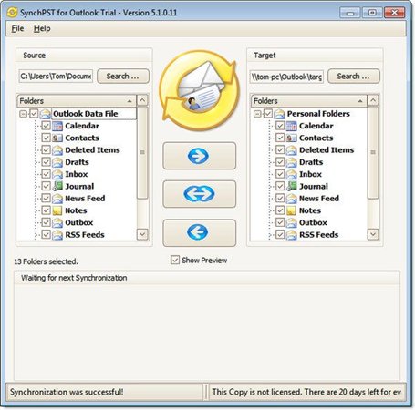 outlook郵箱自動同步軟件(SynchPst for Outlook Professional) v5.1.2.8 免費版 SynchPst for Outlook是outlook郵箱自動同步軟件 可以將Outlook個人文件夾在2臺或更多PC機(jī)自動同步,也可用于桌面機(jī)和筆記本電腦outlook文件夾同步。可選擇單獨或多個文件夾;可選擇是否包括子目錄;支持刪除操作;能同步整個pst文件或僅同步一個特定子目錄。專業(yè)版能自動在其他PC機(jī)或筆記本更新outlook文件。