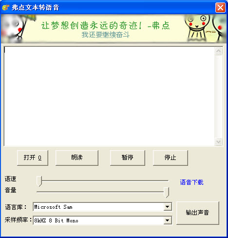 弗點(diǎn)文本轉(zhuǎn)語音(txt文檔轉(zhuǎn)音頻wav)故名思意就是將文本文檔轉(zhuǎn)換為可以聽見的音頻文件!本系統(tǒng)可用于有聲小說 等一切用得著的地方!