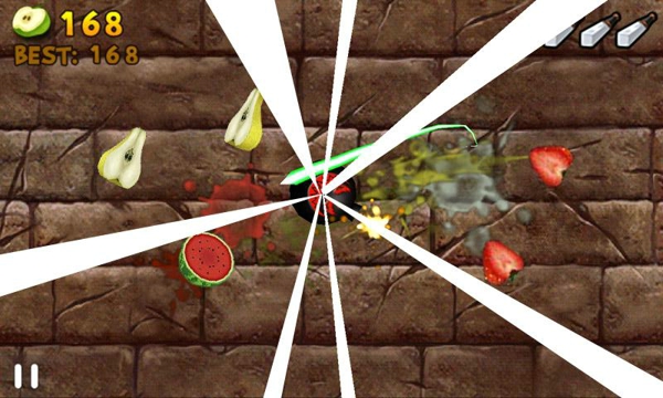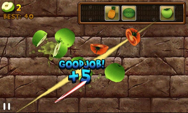 水果忍者作為一款簡單有趣的游戲,上市以來大受歡迎,名列apple store暢銷排行榜前十位。游戲畫面做的非常的精致,切開不同的水果,會開看到不同顏色的鮮艷果肉,而且做得逼真,可以看到果核,肉紋。各種顏色的果汁飛濺到半空,或者飛濺到墻上,為玩家?guī)泶碳さ囊暯求w驗。【操作技巧】