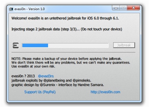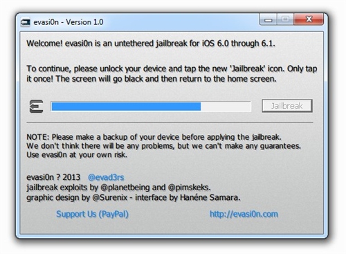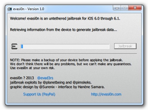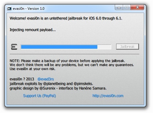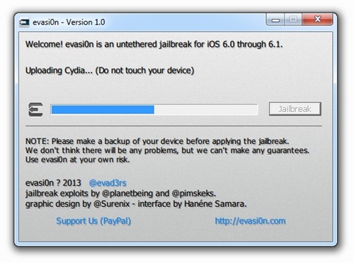 按照此前的承諾,黑客很快更新了iOS 6.x完美越獄工具到Evasi0n v1.4版本,最新版本的Evasi0n 可以支持蘋果今天更新的iOS 6.1.2進行完美越獄。如果你的iOS設(shè)備目前處于iOS 6.1.1或者更低的版本,而且你還希望升級到iOS 6.1.2并保持越獄,那么請備份你的設(shè)備,之后通過iTunes裝載6.1.2的固件(并不是選擇OTA無線升級),之后使用Evasi0n v1.4版本再次進行越獄。iOS 6完美越獄工具evasi0n今日正式放出,此次越獄工具支持iOS 6.0至6.1版本完美越獄,設(shè)備涵蓋所有支持iOS 6系統(tǒng)的iPhone、iPod touch、iPad以及iPad mini。越獄步驟簡單易操作,耗時約5分鐘。