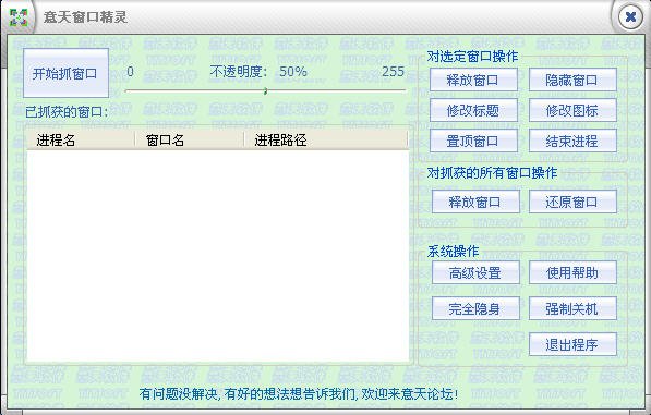 意天窗口精靈是一款Windows操作系統(tǒng)下的隱藏窗口管理工具,其程序精小而功能強(qiáng),可抓住任何可視窗口,并對其進(jìn)行: 窗口透明 處理, 窗口半透明 處理, 隱藏窗口, 修改窗口標(biāo)題, 修改窗口圖標(biāo), 置頂窗口 等操作.