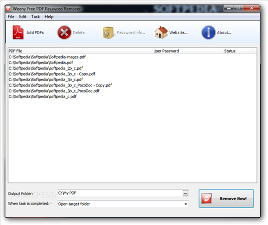 Weeny Free PDF Password Remover 1.1 官方英文版 移除PDF文件保護(hù)(Weeny Free PDF Password Remover)PDF 文件可以設(shè)置保全項(xiàng)目,像是禁止復(fù)制文件內(nèi)容、開(kāi)啟時(shí)有密碼保護(hù)、禁止列印......等等的保護(hù)措施,想要解除 PDF 文件所設(shè)的限制,可以來(lái)使用 Weeny Free PDF Password Remover 這套免費(fèi)軟體來(lái)移除這些保全措施。