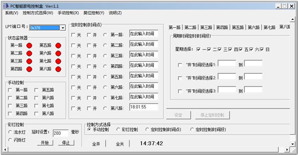 功能性說(shuō)明:PC智能家電控制盒,可以同時(shí)控制8路電器設(shè)備的開(kāi)關(guān)狀態(tài),控制方式可以分為:手動(dòng)控制、彩燈控制、定時(shí)控制三種。