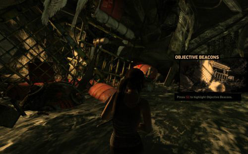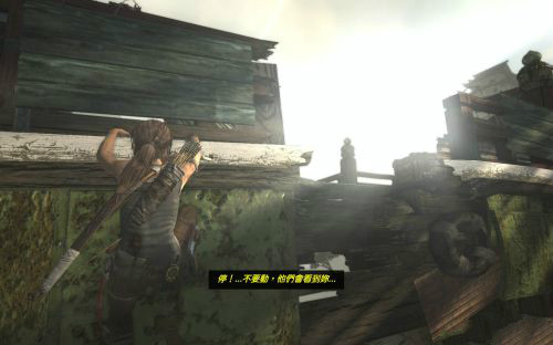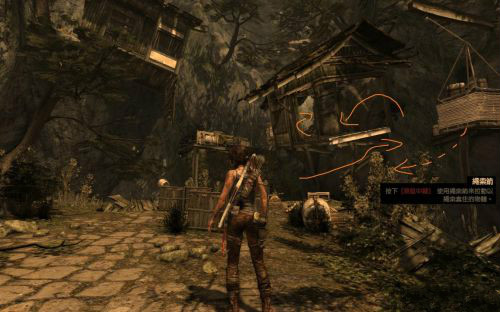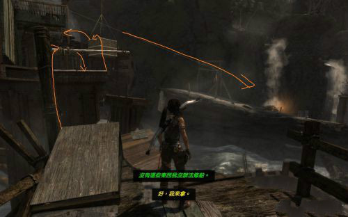 之后看好子彈時間的時候按shift降落到另一端繩橋上,最后勞拉會落入水中,我們需要在激流中用散彈橋打破障礙物來到海灘.