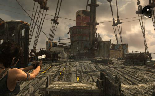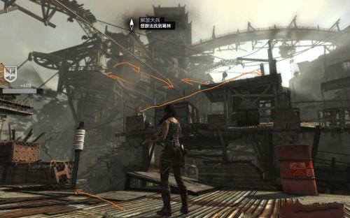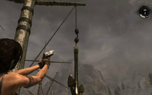 上去以后攀上木板向右爬很快就能見到滑輪組了,之后開槍把它打掉,之后通過剛掉下來的桅桿返回即可,